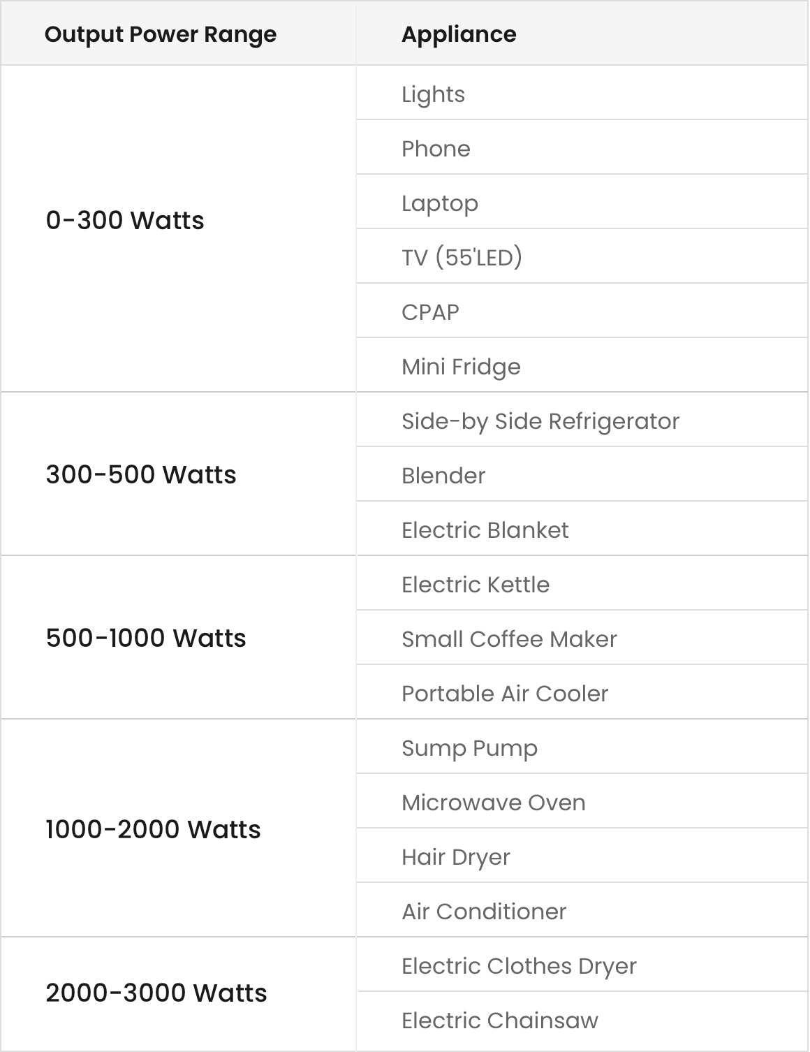 Check the wattage (W) on your appliance's label or user manual to determine its power needs.