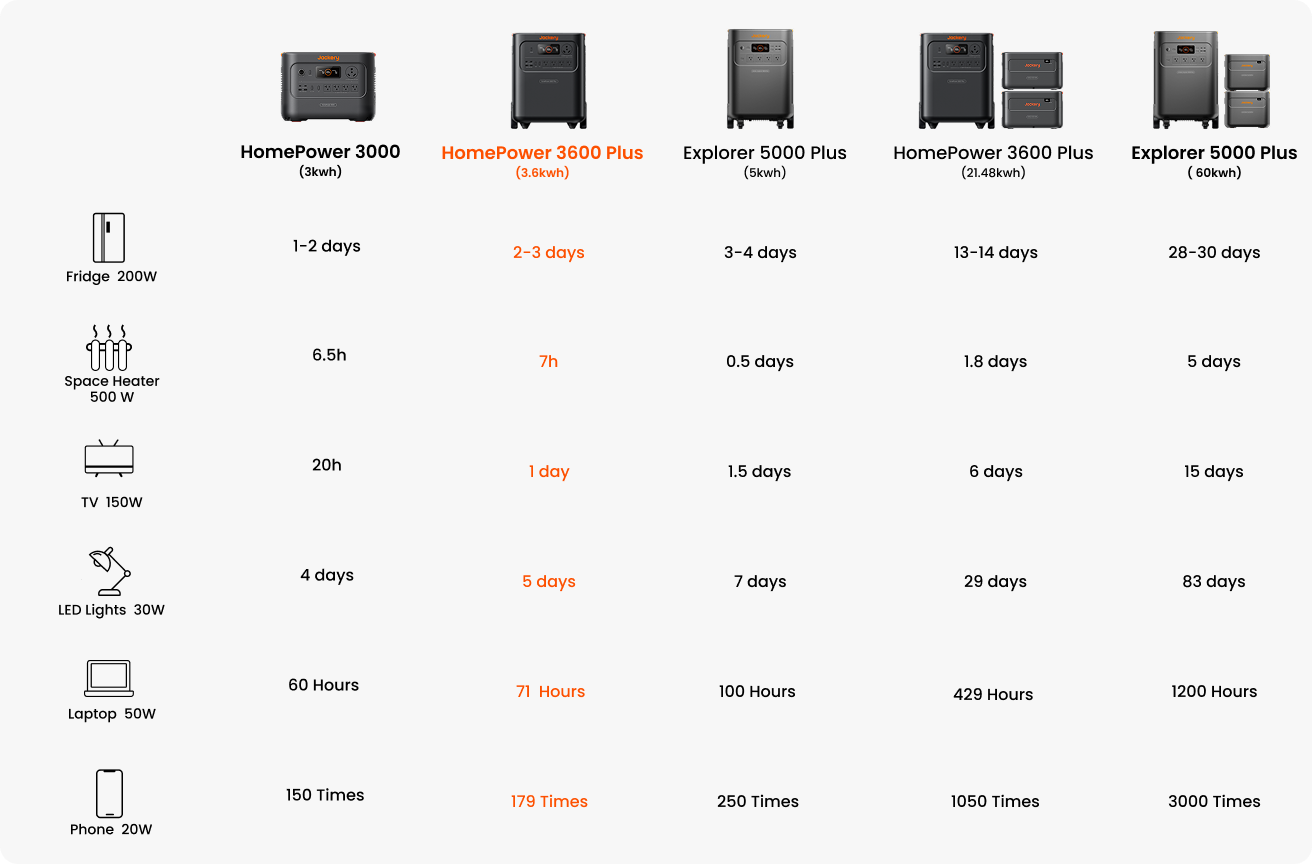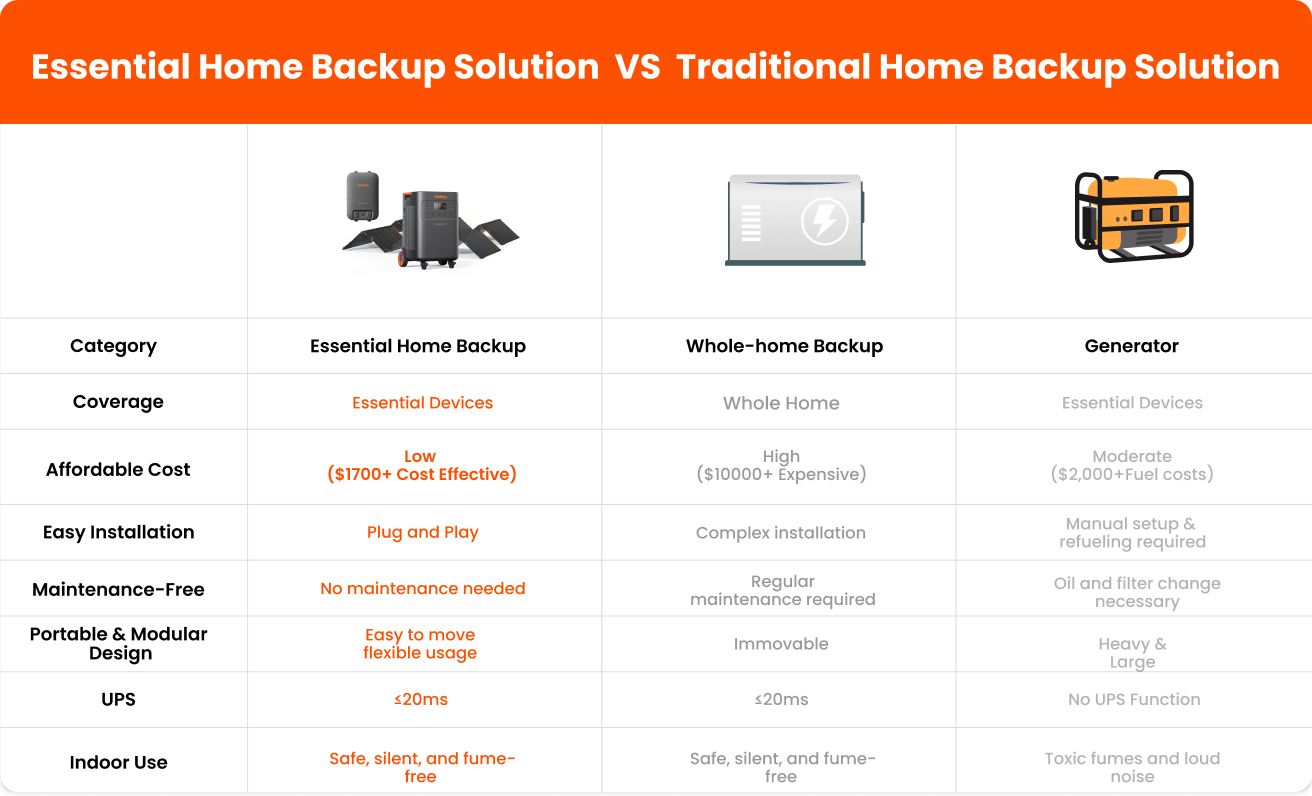 An essential home backup solution is a compact, reliable system designed to keep only your most important household devices and appliances running during an outage, like your fridge, WiFi, or lighting. Unlike whole-home generators, it focuses power on what you actually need in the moment. For example, the Jackery Solar Generator 5000 Plus is ideal for extended outages and provides up to 30 days of essential power. The Jackery Solar Generator HomePower 3600 Plus is ideal for running your core home appliances and provides up to 14 days of fridge backup.