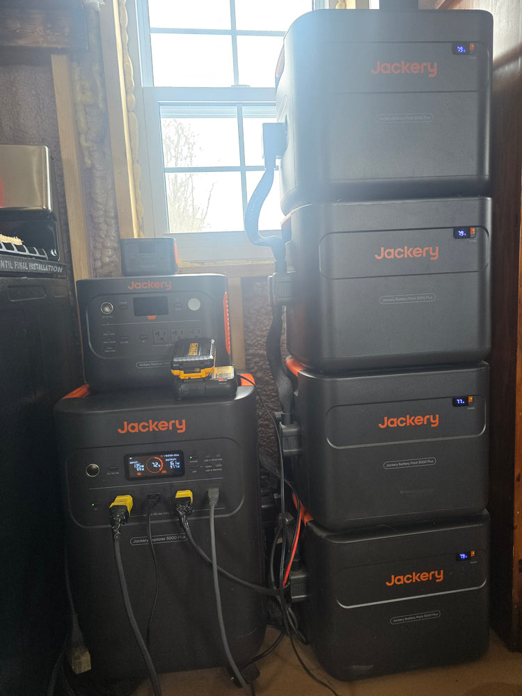 At home, life moves differently. “We came here with nothing,” he recalls. “We sold our house so fast that we ended up living in a tent with a generator and one Jackery Explorer 5000 Plus.” That single unit powered a small fridge, a freezer, and a television while they built their first cabin. “It kept us alive at the start,” he says.