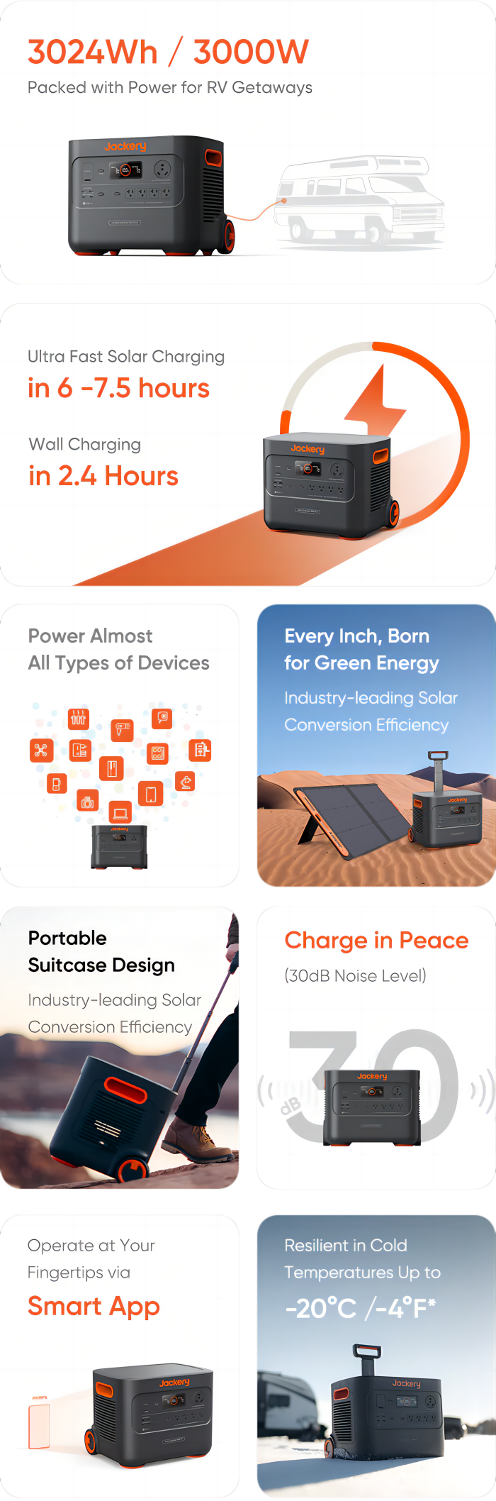 Huge capacity 3024Wh with a massive 3000W power. Longer battery life that supports 99% of appliances. The power station can charge RVs and travel trailers and back you up for blackouts.