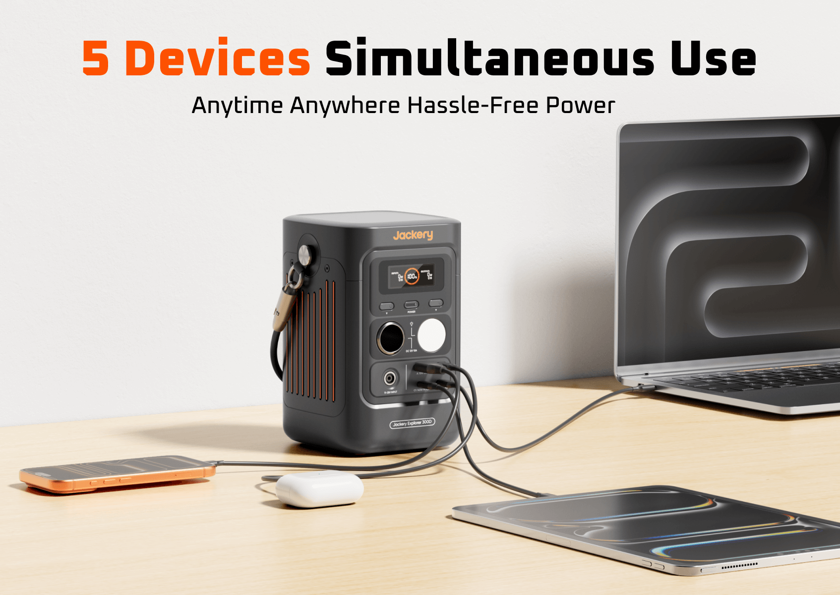 The Explorer 300D supports up to five devices simultaneously, with a 300W max total output, making it suitable for camping setups, mobile workstations, or home backup needs.