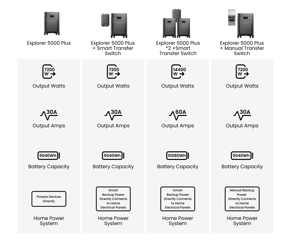 Jackery Explorer 5000 Plus offers powerful, eco-friendly home backup with 5-60kWh capacity and dual voltage output (120V/240V). It supports various appliances during outages with 12 output ports, 7.2-14.4kW power, and a 0ms UPS switch for seamless operation of essential devices like fridges, computers, home servers, routers, and ventilators. Smart app control and multiple charging options add convenience, while its zero-emission design ensures safe indoor use.