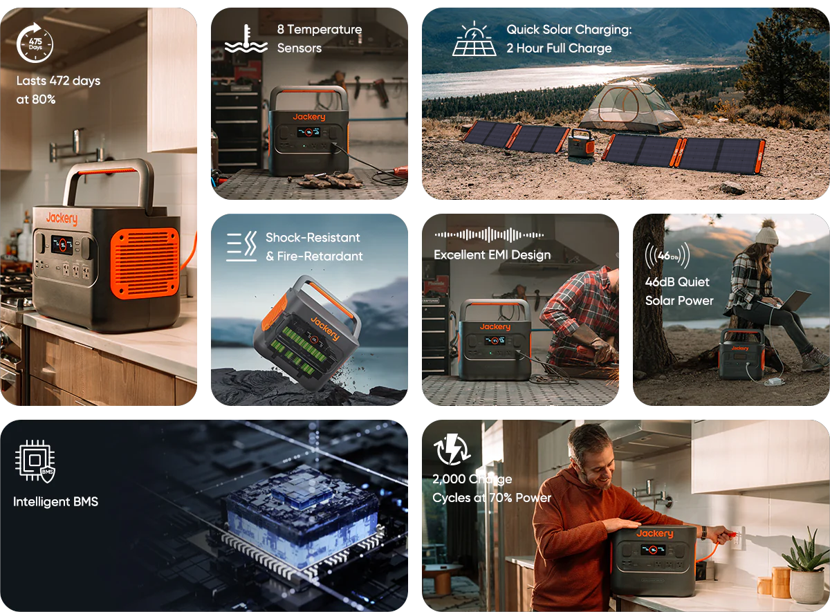 Jackery Solar Generator 1500 Pro Station charges all devices imaginable. With a battery capacity of 1512Wh, the portable design at only 37.4 lbs is perfect for outdoor usage. Explorer 1500 Pro provides industry-leading performance with its intelligent BMS with 12 forms of protection, excellent EMI design, and an unrivalled cooling system. Explore anywhere you desire!