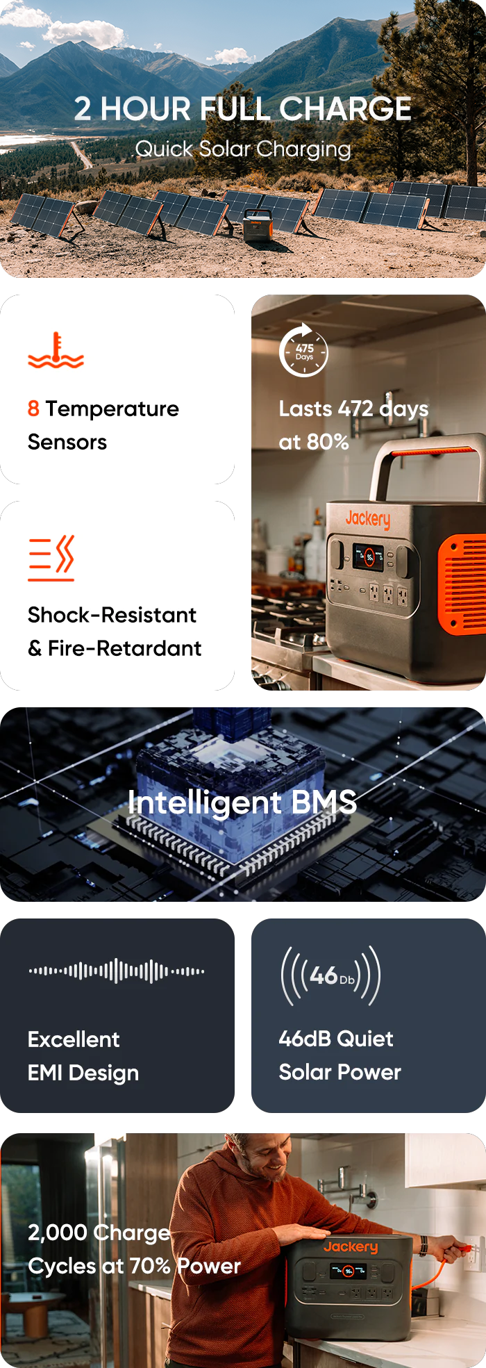 The power station is incredibly durable and very long-lasting, with the outer shell having the highest UL requirements, featuring top 94V-0 fireproof material, and passing safety drop standards. The ETFE-laminated design make solar panels extremely temperature and corrosion resistant. Strength and reliability is completely guaranteed.